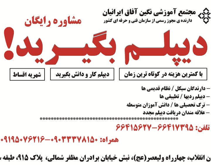 اخذ دیپلم کامپیوتر، اخذ دیپلم حسابداری، اخذ دیپلم نقشه کشی، اخذ دیپلم معماری، اخذ دیپلم هتلداری، اخذ دیپلم گردشگری، اخذ دیپلم گرافیک، اخذ دیپلم مکانیک و برق خودرو و …اخذ دیپلم رسمی، آسان و قانونی در رشته های متفاوت